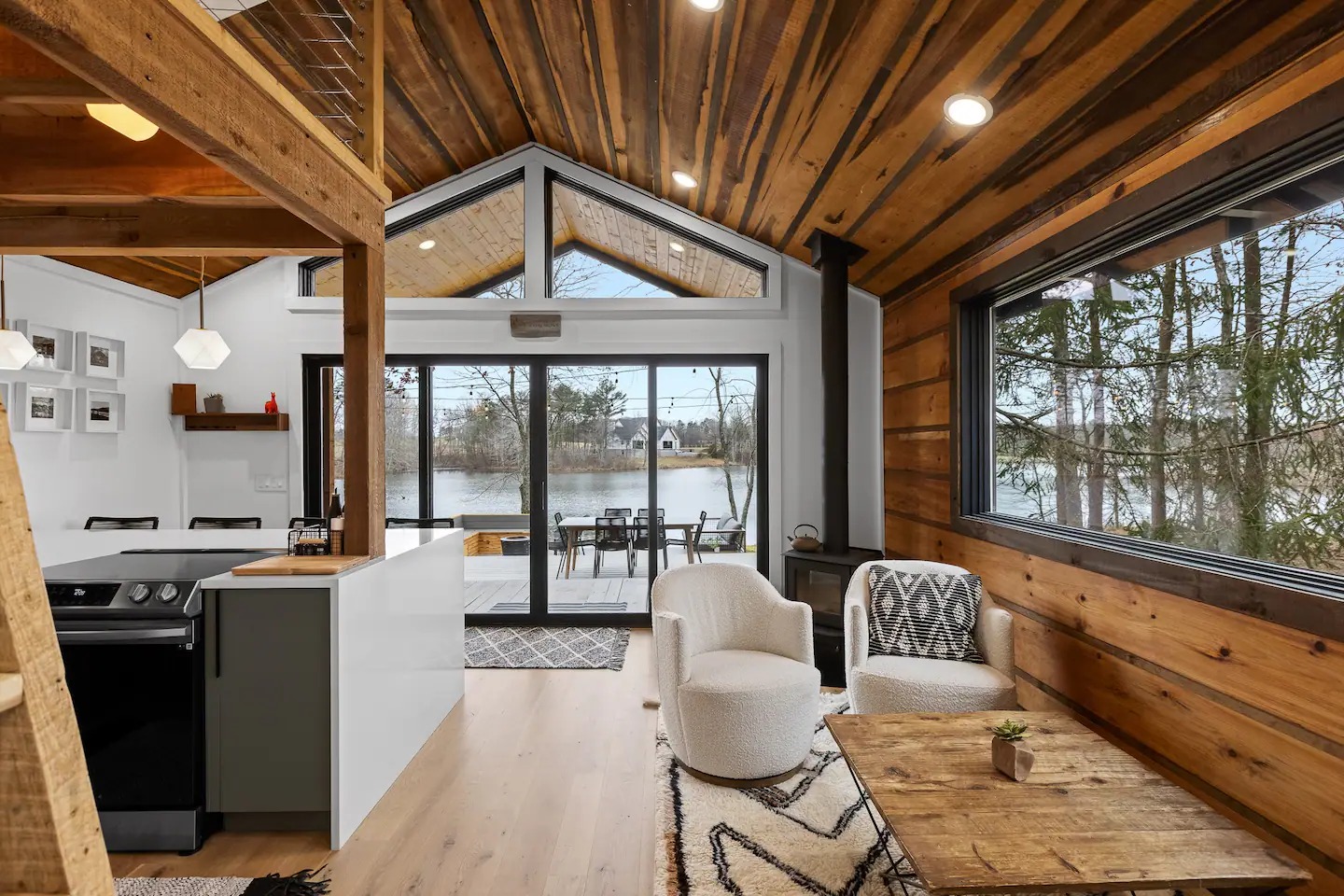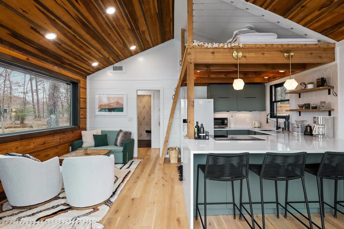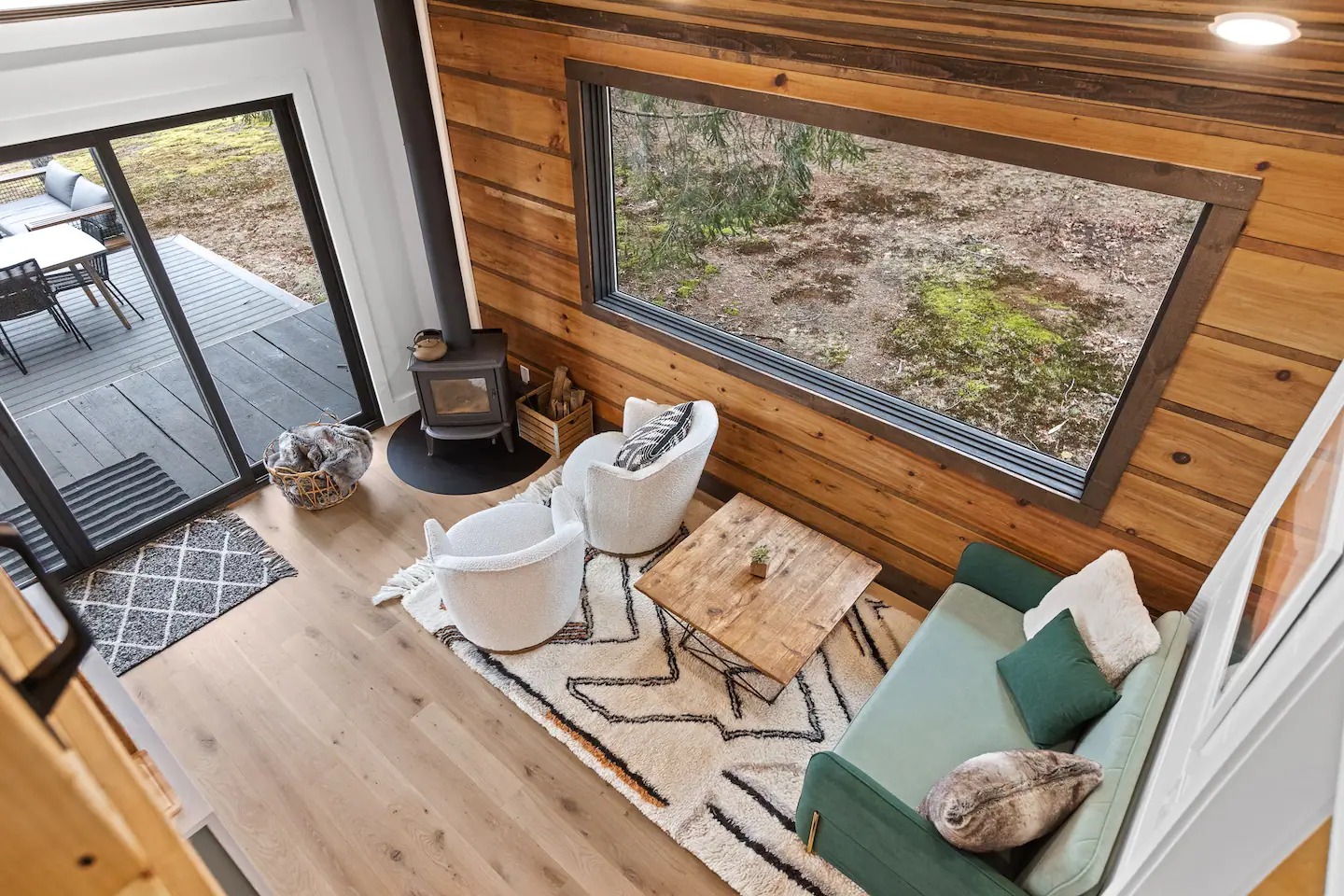 The dominance of natural materials is important in the interior of the wooden tiny house. Wooden floors, walls, and ceilings help create a rustic and stylish atmosphere. By preserving the natural tones of the wood, you can make the space warm and inviting. You can also choose wooden materials in the selection of furniture and use comfortable seating groups furnished with organic fabrics.