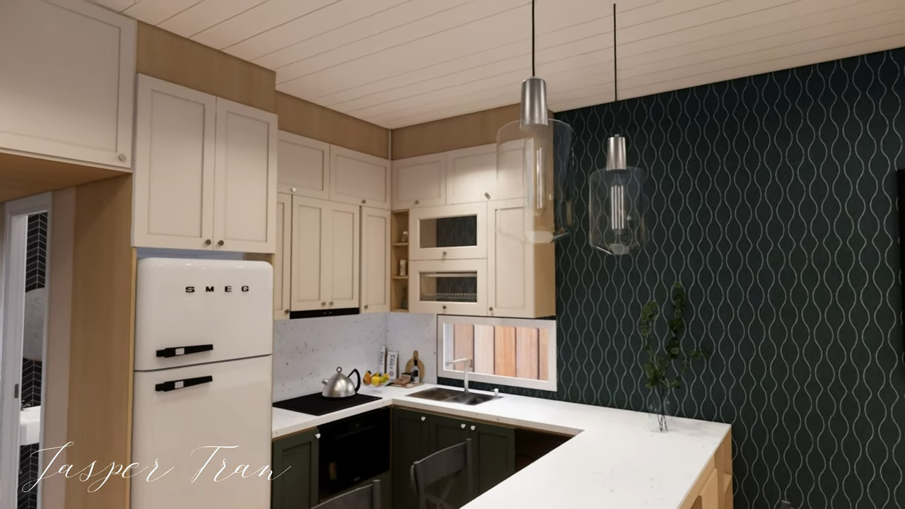 In the interior, it is seen that every square meter is used with maximum efficiency. Cleverly arranged furnishings and storage spaces offer homeowners the opportunity to eliminate unnecessary items. The open-plan kitchen and living room facilitate interaction between family members or guests, providing a spacious feeling even while cooking or relaxing.