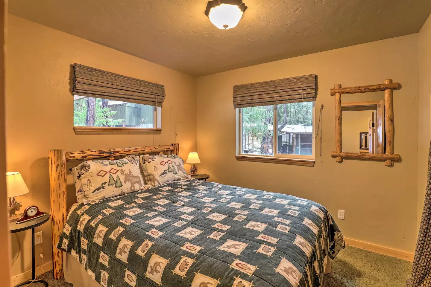One of the most beautiful features of the wooden cabin house is the bedrooms. The bedrooms are decorated with rustic wooden furniture and bedspreads. Each bedroom is equipped with a private bathroom and toilet. Bathrooms are equipped with modern sinks and showers.