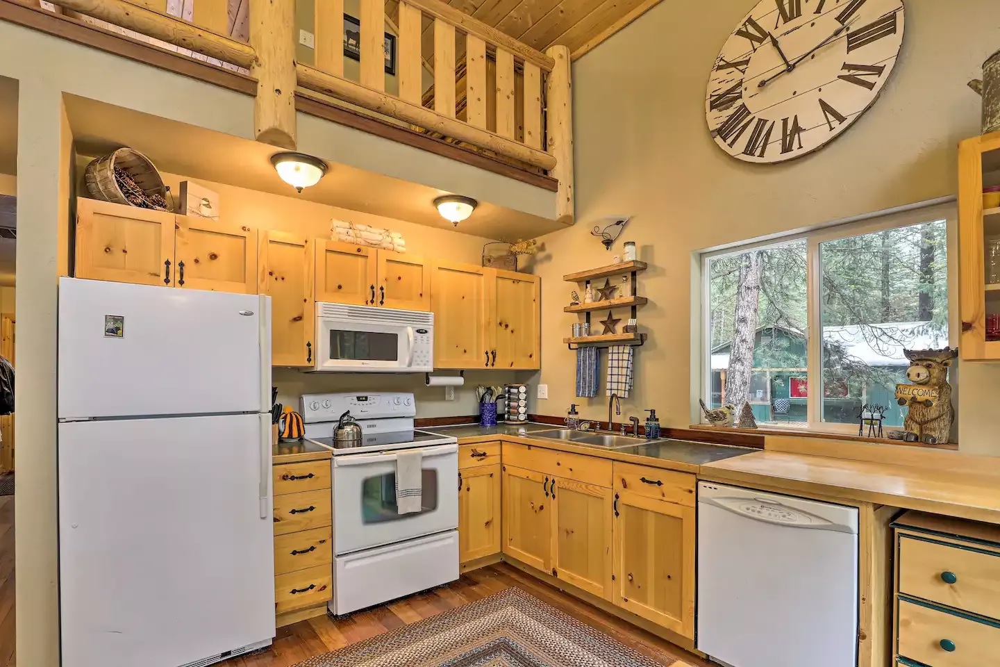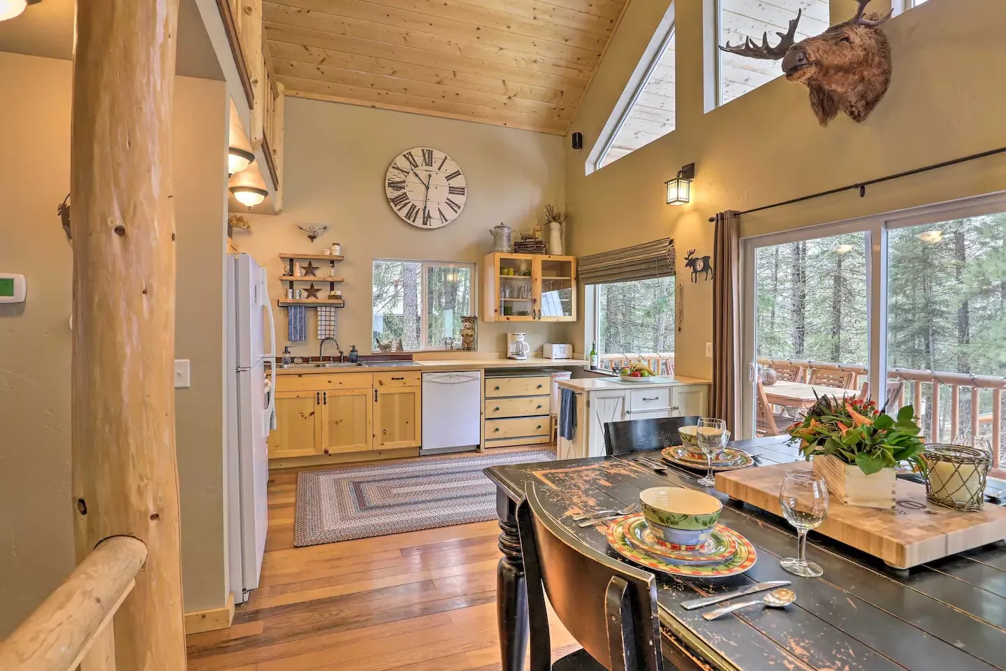 This wooden cabin house is built on a large land and offers a scenic view around it. The house is built in a rustic style and provides natural light with wood material, high ceilings, and large windows.