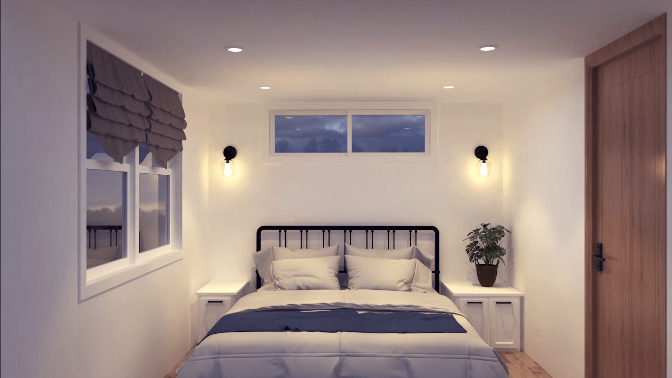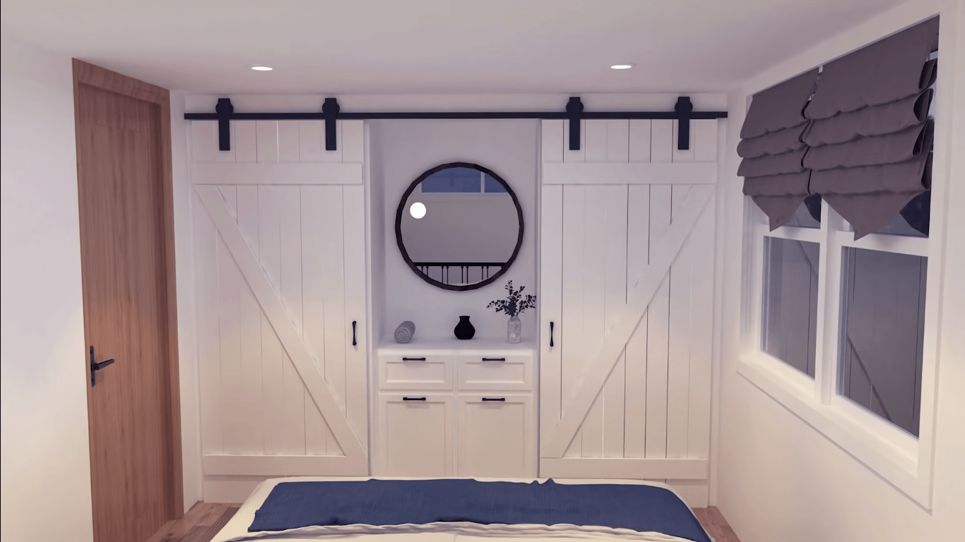 This 42-square-foot tiny house plan doesn’t just include the living spaces; storage solutions are also considered. Cabinets, built-in shelves, and multi-purpose furniture help you keep your household items organized. In addition, by using the free space under the pull-out bed, it is possible to store seasonal clothes or items with a low frequency of use.