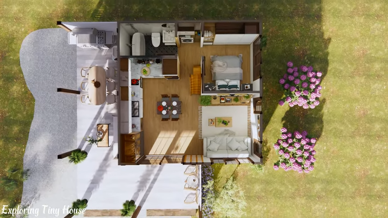 The exterior design of this type of tiny house is also important. Roof terraces or outdoor seating areas expand the living space and create an atmosphere in touch with nature. The use of natural materials and plants makes the exterior of the house more attractive.
